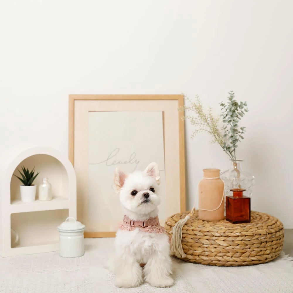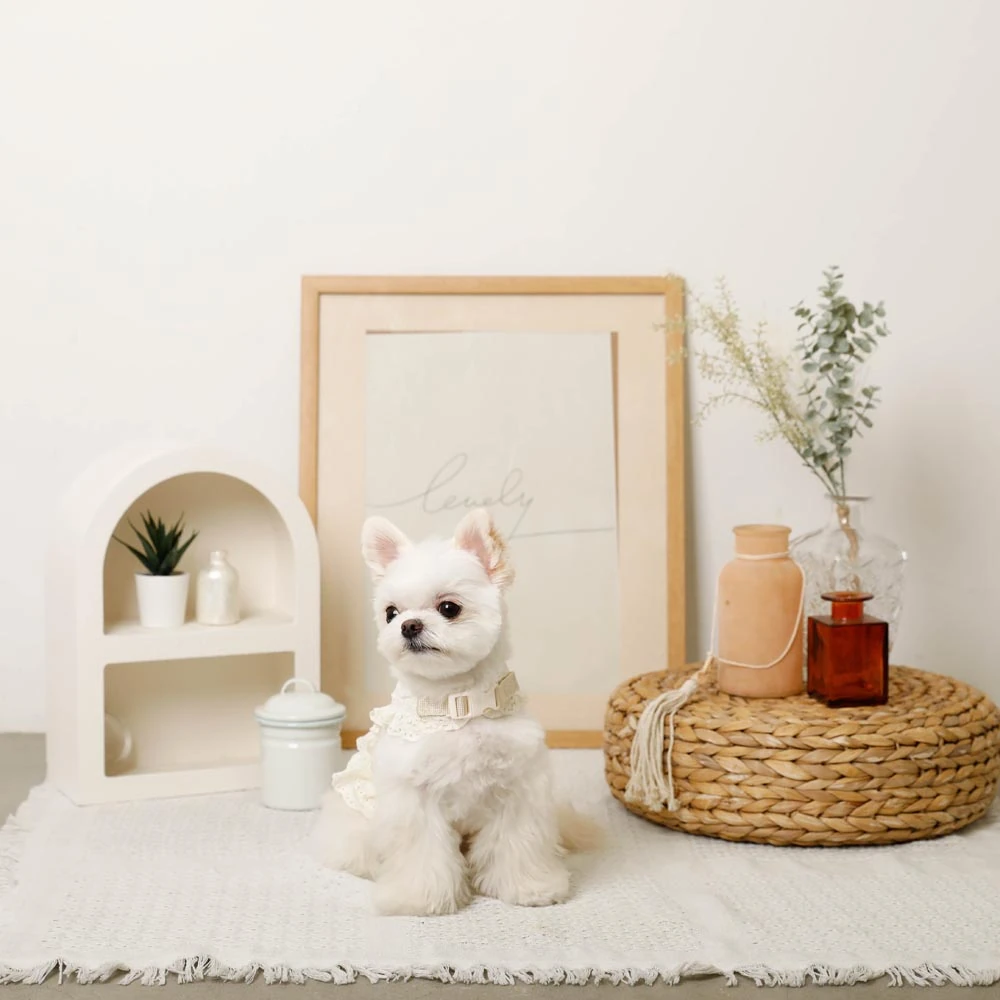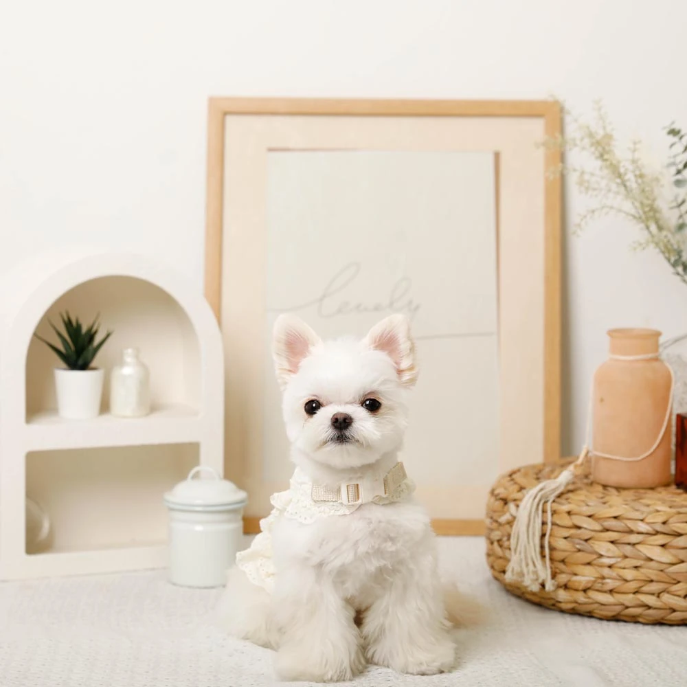 繊細なレースワークとエレガントなフリルデザインは、職人の手作業による丁寧な仕上げです。どの角度から見ても美しく、愛犬の動きに合わせて優雅に揺れるフリルが、より一層の可愛らしさを引き出します。