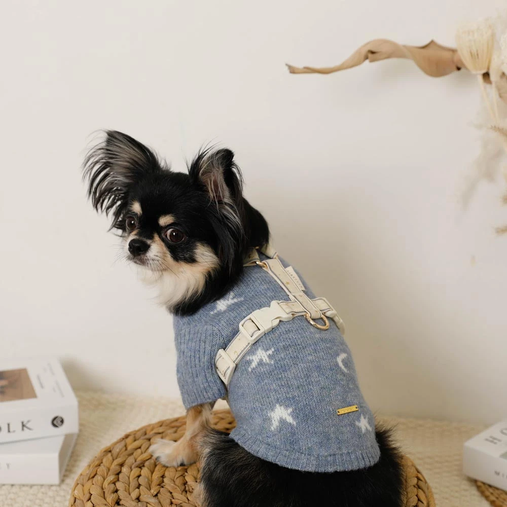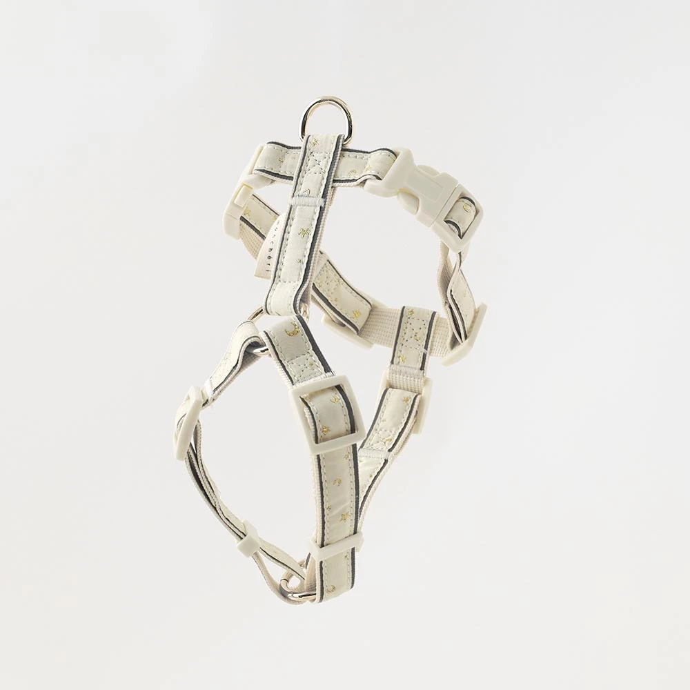 当ハーネスの最大の特徴は、安全性と美的感覚を見事に融合させた点にあります。360度全方位に反射素材を採用し、あらゆる角度からの光を効果的に反射。夜間の車のヘッドライトや街灯の光を確実にキャッチし、愛犬の存在を明確にアピールします。反射部分には繊細な星柄パターンを施し、単なる安全アイテムではなく、ファッショナブルなアクセサリーとしての価値も兼ね備えています。